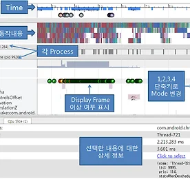 #android 썸네일형 리스트형 안드로이드 성능 Systrace 분석 방법-2 Systrace툴을 통해서 다운받은 HTML을 Chrome을 통해서 열면 아래와 같은 화면을 볼수 있다. 각 구분에 대한 설명은 아래와 같다. Zoom을 하거나 선택에 따라서 아래와 같이 미리 설정된 Log에 따라서 정보를 보여준다. 해당 화면에서 자주쓰는 동작키는 아래와 같다.w : 위치한 TimeLine에서 zoom ina : Time line 좌측이동s : 위치한 TimeLine에서 Zomm outd : Time line 우측이동 왼쪽, 오늘쪽 방향키 : 좌우 Event로 이동 1,2,3,4 : Mode변경 더보기 안드로이드 성능 Systrace 개요와 시작방법 안드로이드에는 여러가지 분석을 tool들을 제공하고 있습니다.성능분석을 위한 Tool들도 제공하고 있는데요. 많이 사용하는것은 Systrace, Trace View등이 있습니다. Systrace 개요: Android 성능 분석도구로 CPU scheduler, threads, application 정보를 추출하여 HTML파일로 생성합니다. 안드로이드에서 화면 끊김현상을 주로 Jank가 발생했다고 하는데요. 이런 Jank가 발생하는 Frame분석과 Jank 발생 구간에서 CPU 동작에 대한 분석자료를 제공하여 성능분석에 유용하게 많이 사용되고 있는 tool입니다. Systrace 시작하기 :1.Android Device Monitor에서 Device 선택 후, Systrace Icon을 선택합니다.2.저장 .. 더보기 이전 1 다음